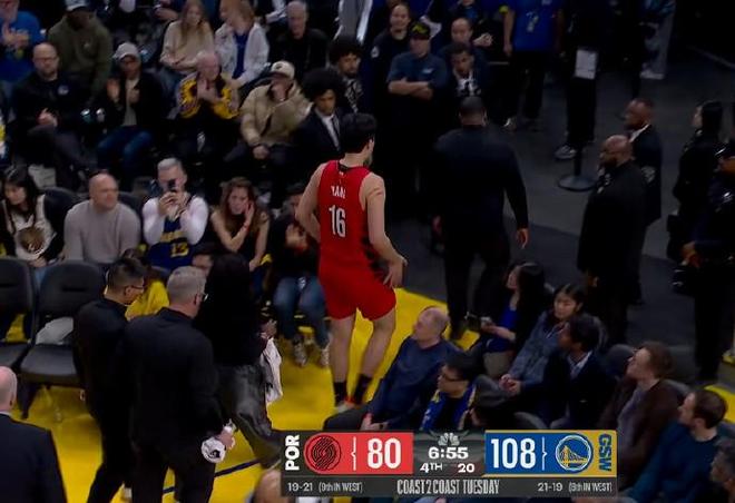在比賽進(jìn)行到第四節(jié)時,讓中國球迷揪心的一幕出現(xiàn)了:楊瀚森在一次進(jìn)攻中積極拼搶,但后腦勺不慎撞到了勇士后衛(wèi)威爾-理查德膝蓋,痛苦倒地。隨后開拓者的隊醫(yī)進(jìn)行檢查后讓其返回更衣室進(jìn)行檢查。