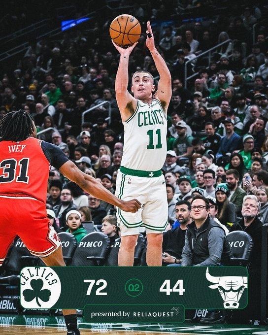 次節(jié)比賽,凱爾特人連續(xù)兩節(jié)單節(jié)得分35+,且用出色防守限制公牛首次單節(jié)不足20分。凱爾特人持續(xù)攻防碾壓公牛,率先打出一波21-6攻勢(shì),已經(jīng)擴(kuò)大57-33領(lǐng)先24分優(yōu)勢(shì)。凱爾特人之后繼續(xù)擴(kuò)大70-41領(lǐng)先優(yōu)勢(shì),公牛略有反撲追分,上半場(chǎng)結(jié)束凱爾特人擴(kuò)大72-44領(lǐng)先公牛28分優(yōu)勢(shì)。前兩節(jié)比賽,凱爾特人48中28接近6成準(zhǔn)星,其中三分19中10,布朗18分、普里查德16分與武切維奇10+6;公牛三分17中6,全隊(duì)沒(méi)有球員得分上雙。